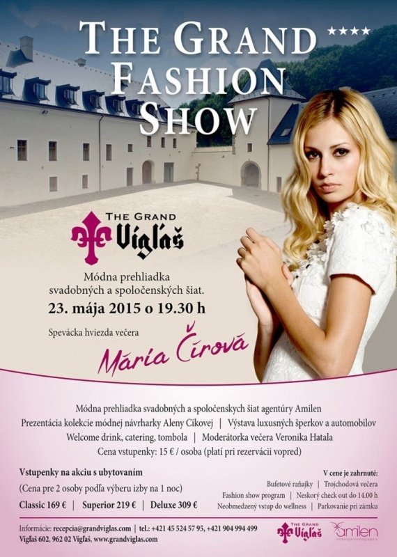 Milovníci módy, drahých áut a šperkov – zbystrite pozornosť! Máme pre vás tip na nadchádzajúci víkend. Vígľašský zámok v sobotu 23. mája 2015 ožije ženskou krásou a luxusnými značkami. So šiestimi módnymi kolekciami sa predvedú umelci štyroch módnych značiek. Módna návrhárka Alena Ciková predstaví kolekciu s názvom V zajatí farieb alebo kráčajúca múza. Luxusné kolekcie pre náročné zákazníčky pripravili aj tvorcovia slovenskej módnej značky Chantall. Medzinárodná módna značka Sugarbird  zameraná na streetwear a party wear, zase ukáže na modelkách kolekcie elegantných šiat. Spoločenské a svadobné šaty s doplnkami vlastnej značky, ale aj francúzskej, talianskej a portugalskej značky, pripravili v svadobnom salóne ELLEN. Programom bude sprevádzať moderátorka Veronika Hatala. Špeciálnym hosťom večera je speváčka Mária Čírová, ktorá bude vystupovať počas prestávok medzi kolekciami. Informuje o tom marketingový riaditeľ hotela The Grand Vígľaš Branislav Lupták.
