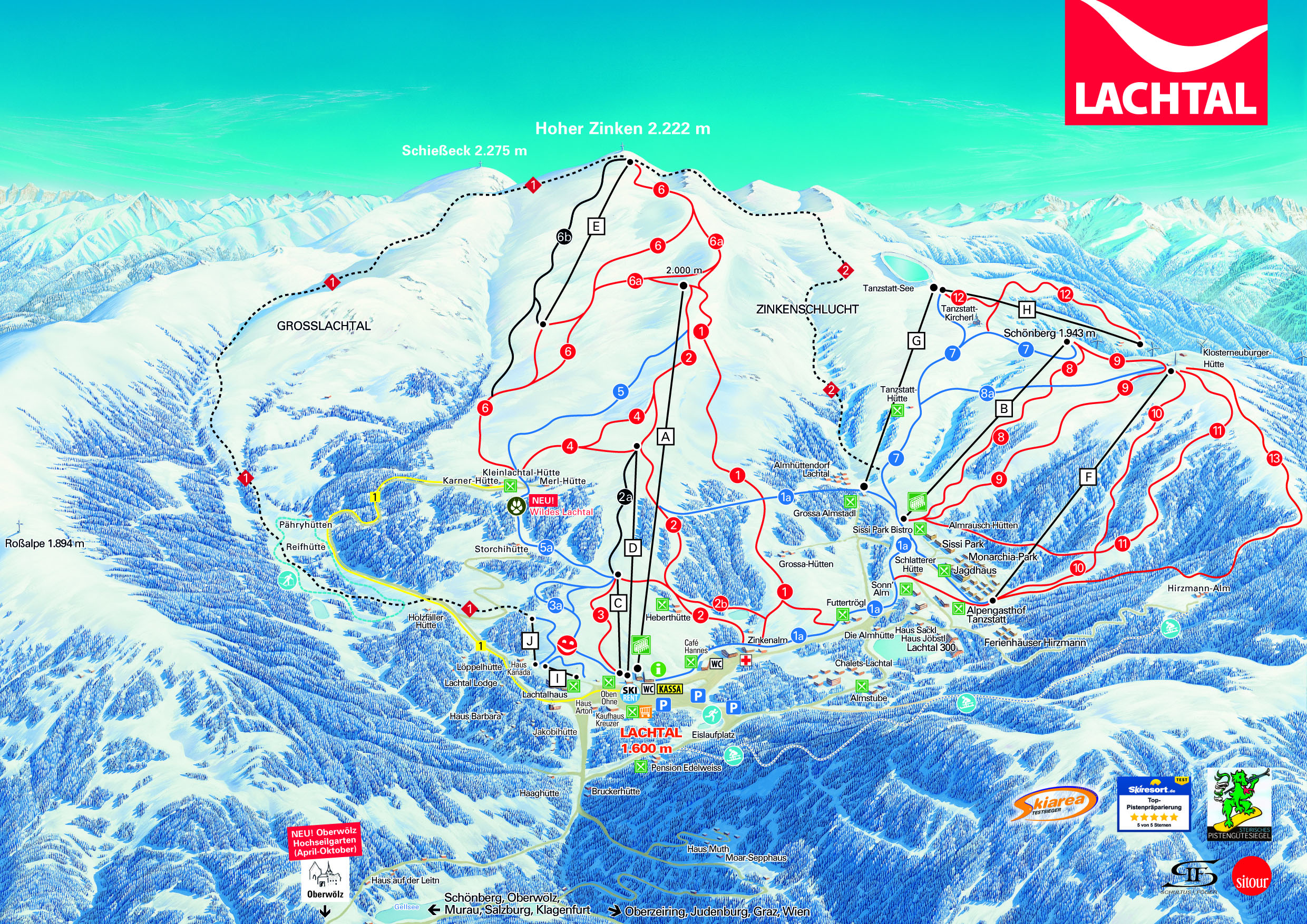 Pre náročnejších lyžiarov je pripravený zjazd Zinkelschlucht z Grossen Zinke. Lachtal láka tiež svojimi typickými horskými chatami s možnosťou aprés-ski za výhodné a príjemné ceny.