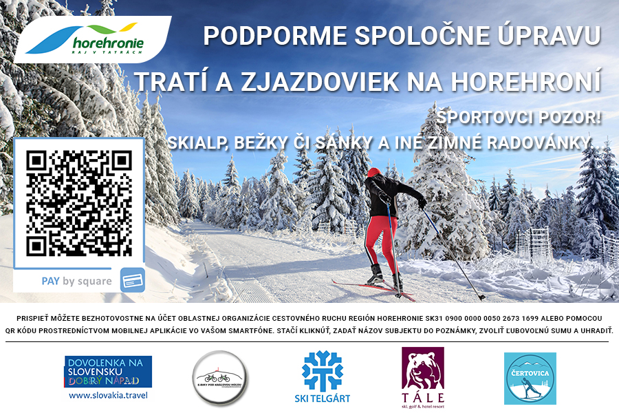 Prispieť môžete bezhotovostne na účet oblastnej organizácie cestovného ruchu Región Horehronie SK31 0900 0000 0050 2673 1699 alebo pomocou QR kódu prostredníctvom mobilnej aplikácie vo vašom smartfóne. Stačí kliknúť, zadať názov subjektu do poznámky, zvoliť ľubovoľnú sumu a uhradiť.