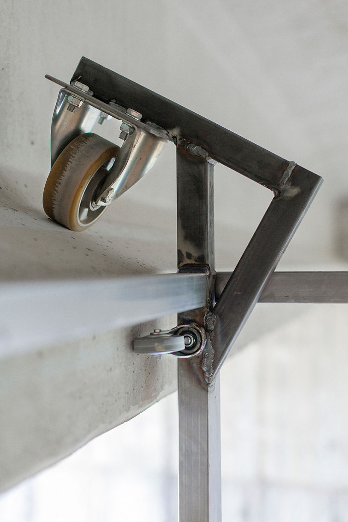 Pre prístup k mikroobytnému domu používa dizajnér ručnú kľuku, ktorá prepravuje základňu k nábytku a tá je pripevnená k betónovej stene mosta.